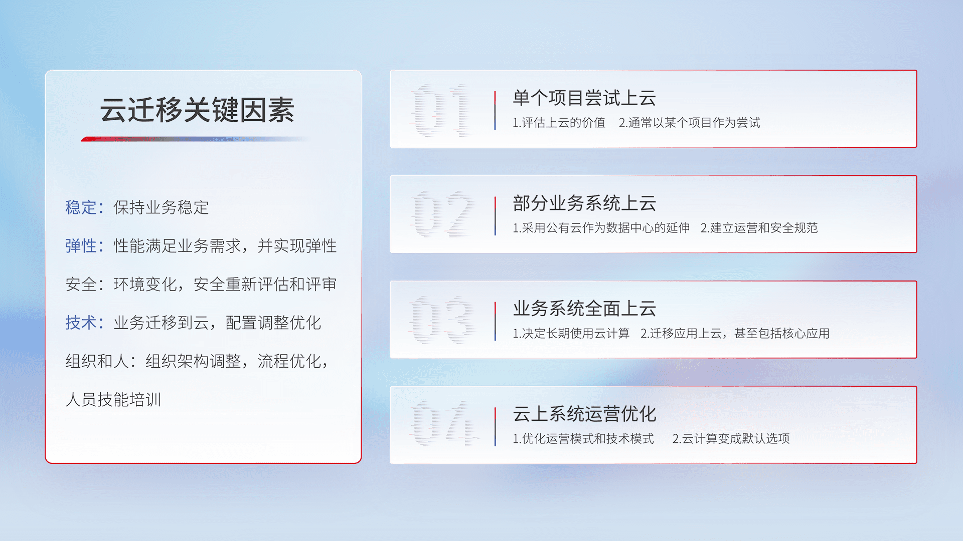 结合实际业务,,从规划设计、、、、云平台选型、、云原生改造、、、数据迁移、、、集成交付,,,迁移全过程为客户识别最佳上云路径,,,做好风险识别管理,,,设计网络架构、、身份权限、、、安全审计合规、、、操作审计、、、、日志审计、、、、监控告警策略、、、多站点容灾设计等,,对云上基础设施进行整体规划,,,,提升IT治理水平,,,以满足弹性、、、、高可用、、、高性能的需求。。
