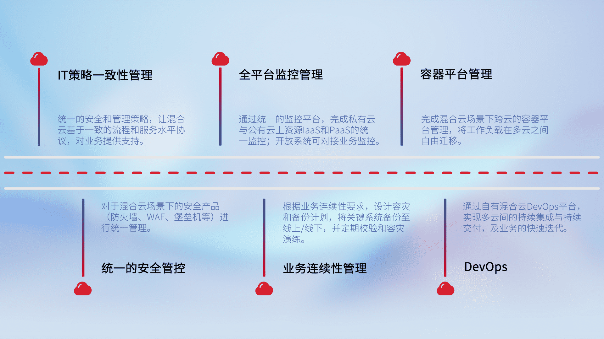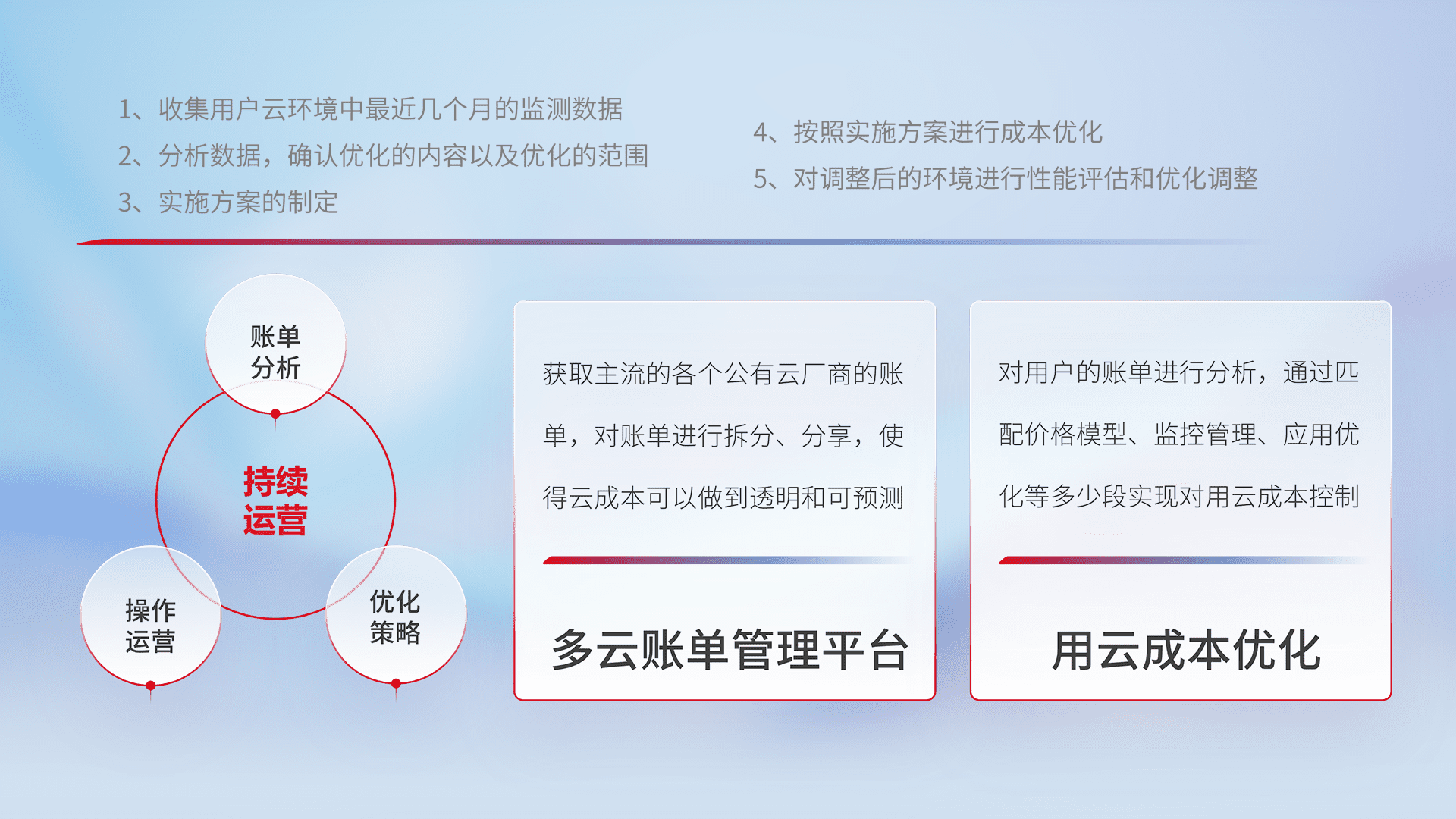 通过多云纳管,,以统一的资源数据模型把客户的云资源进行抽象和封装,,进而实现对多云资源的统一操作,,保障云资源管理的可靠性、、、稳定性与可用性。。量身定制化运维内容,,,配置、、、开发运维、、、、补丁管理、、、、备份、、、监控、、、认证和访问管理、、审计和日常巡检等,,,保障在用云过程中的可靠度,,,,稳定度以及高可用率。。。