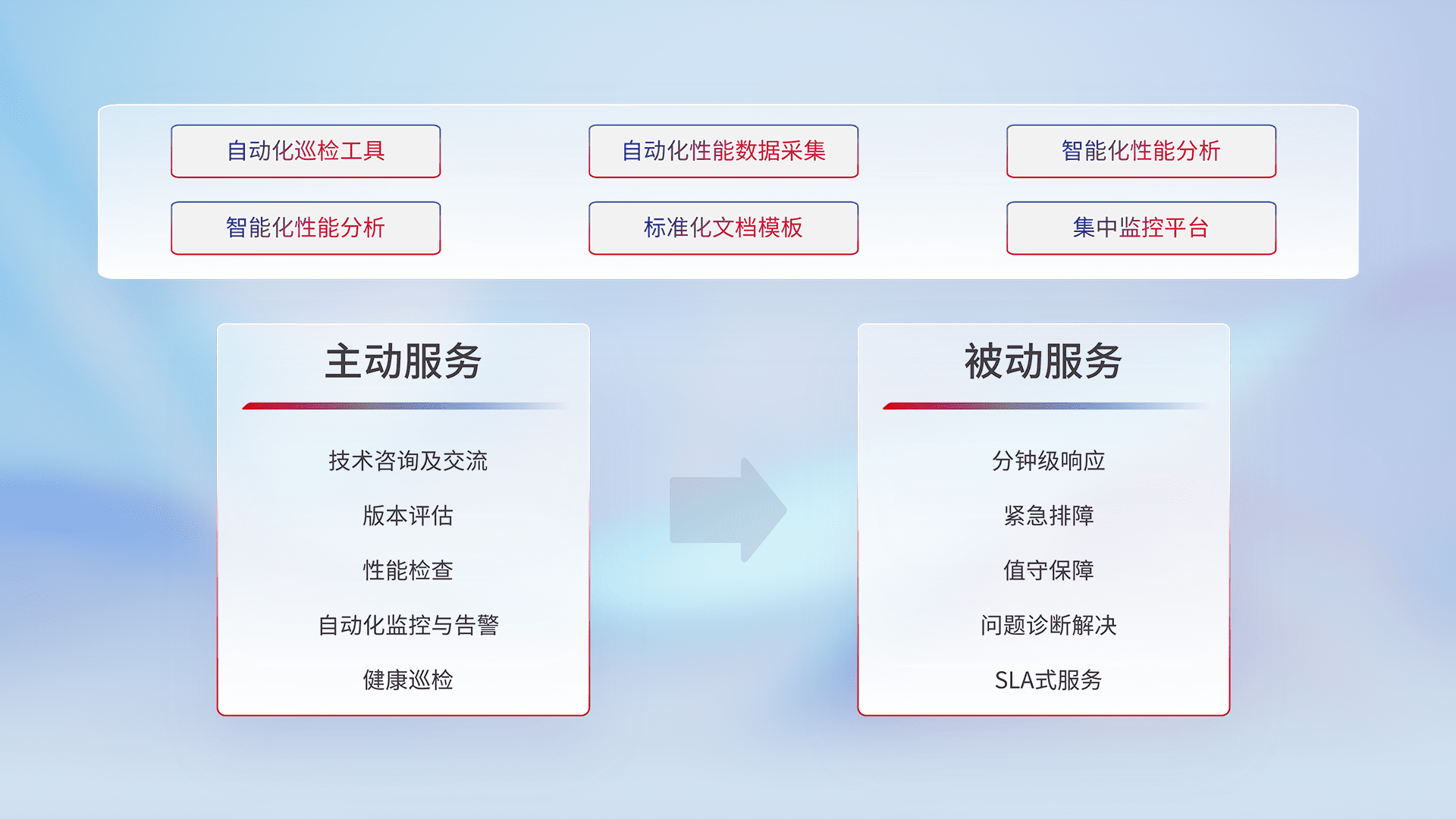 智能化工具和标准化文档,,保障服务质量,,,提供主动服务(包含技术咨询、、、版本评估、、、性能检查、、自动化监控与告警、、健康巡检)和被动服务包含(分钟级响应、、紧急排障、、、值守保障、、、问题诊断解决、、、、SLA服务)。。